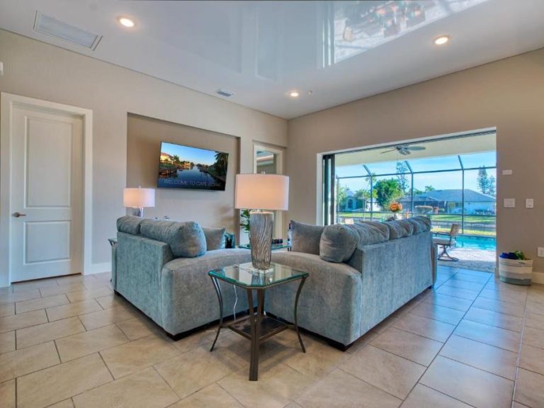 n unserem lichtdurchfluteten Wohnbereich erwarten Sie bequeme Sofas und ein großer 85‑Zoll Smart‑TV mit Soundsystem — ideal für gemütliche Filmabende oder entspannte Stunden nach einem sommerlichen Tag in Florida.
