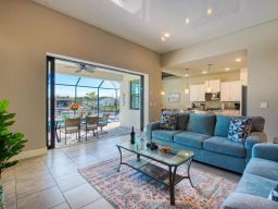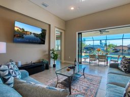 Direkt verbunden mit dem Wohnbereich ist die großzügige, überdachte Lanai mit Blick aufs Wasser — mit Außen‑TV, Sonos‑Sound, Grill und gemütlichen Loungemöbeln ideal für entspannte Abende bei Sonnenuntergang.